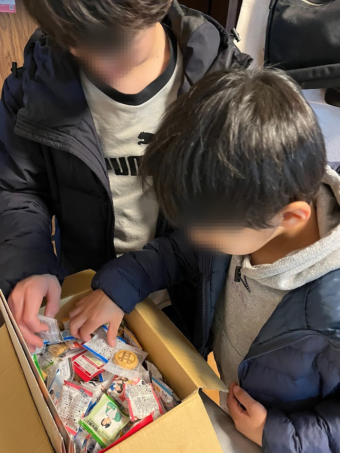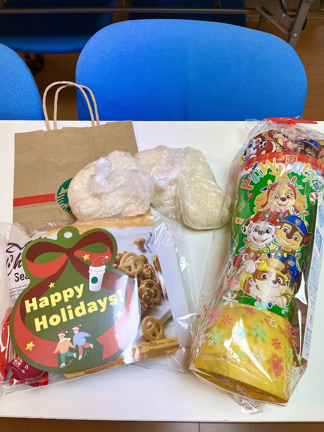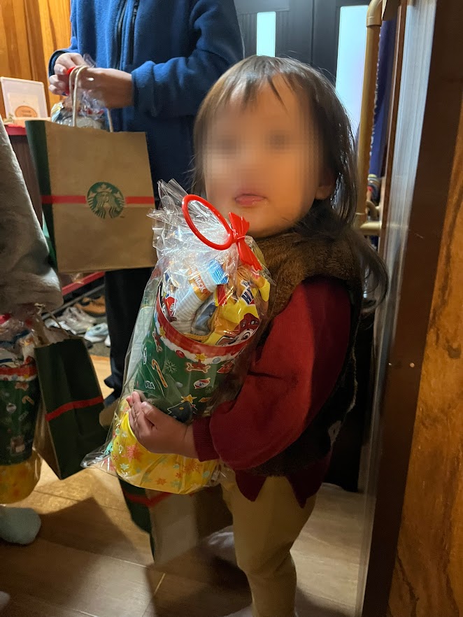 またお持ち帰りのおみやげにはお米6合の他、子どもにはクリスマス菓子ブーツとスタバのお菓子セット。大人には好きな食品1個をお渡ししました。