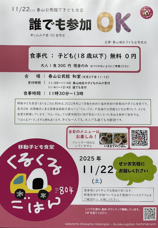食事代:子ども(18歳以下) 無料・大人ひとり1食300円 現金のみ おつりの無いようご準備をお願いします。